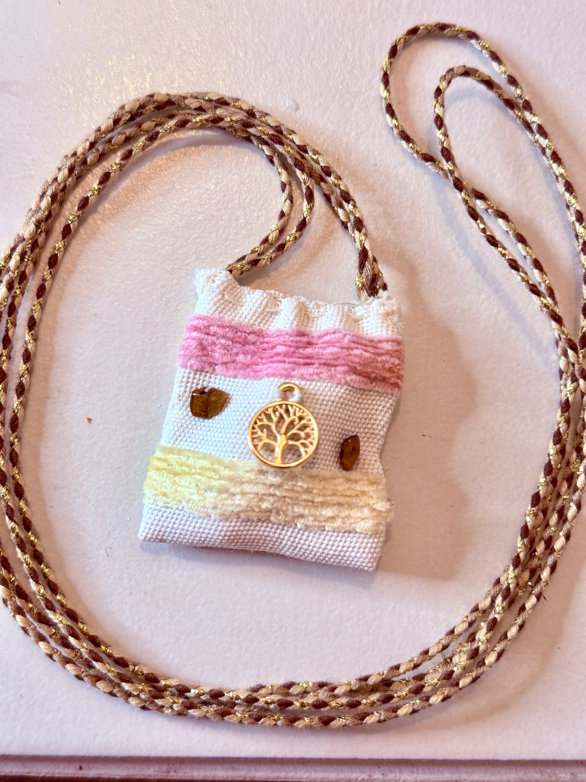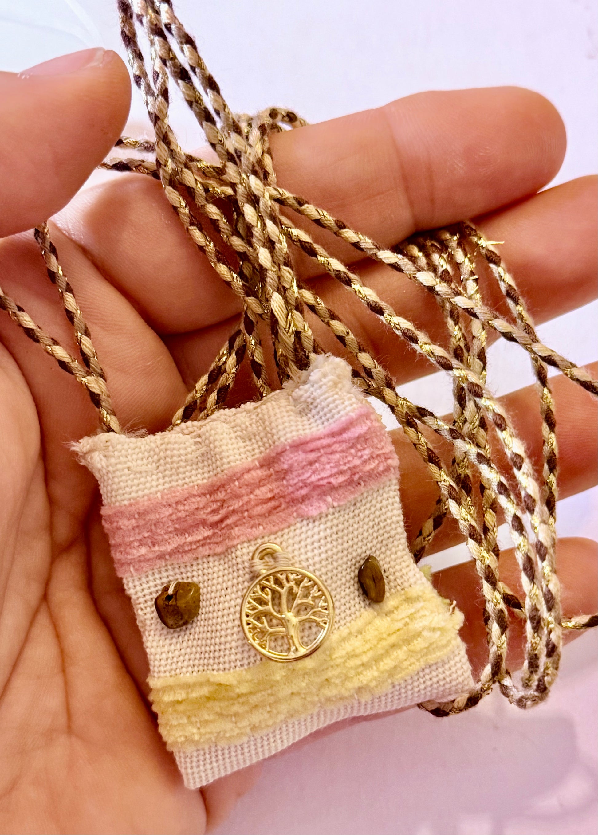 Cette amulette est cousue Ă la main, dans un tissu doux et lumineux, inspirĂ© des couleurs de lâaube : le rose pour la tendresse envers soi, le jaune pour la joie, la vitalitĂ© et lâĂ©lan intĂ©rieur.