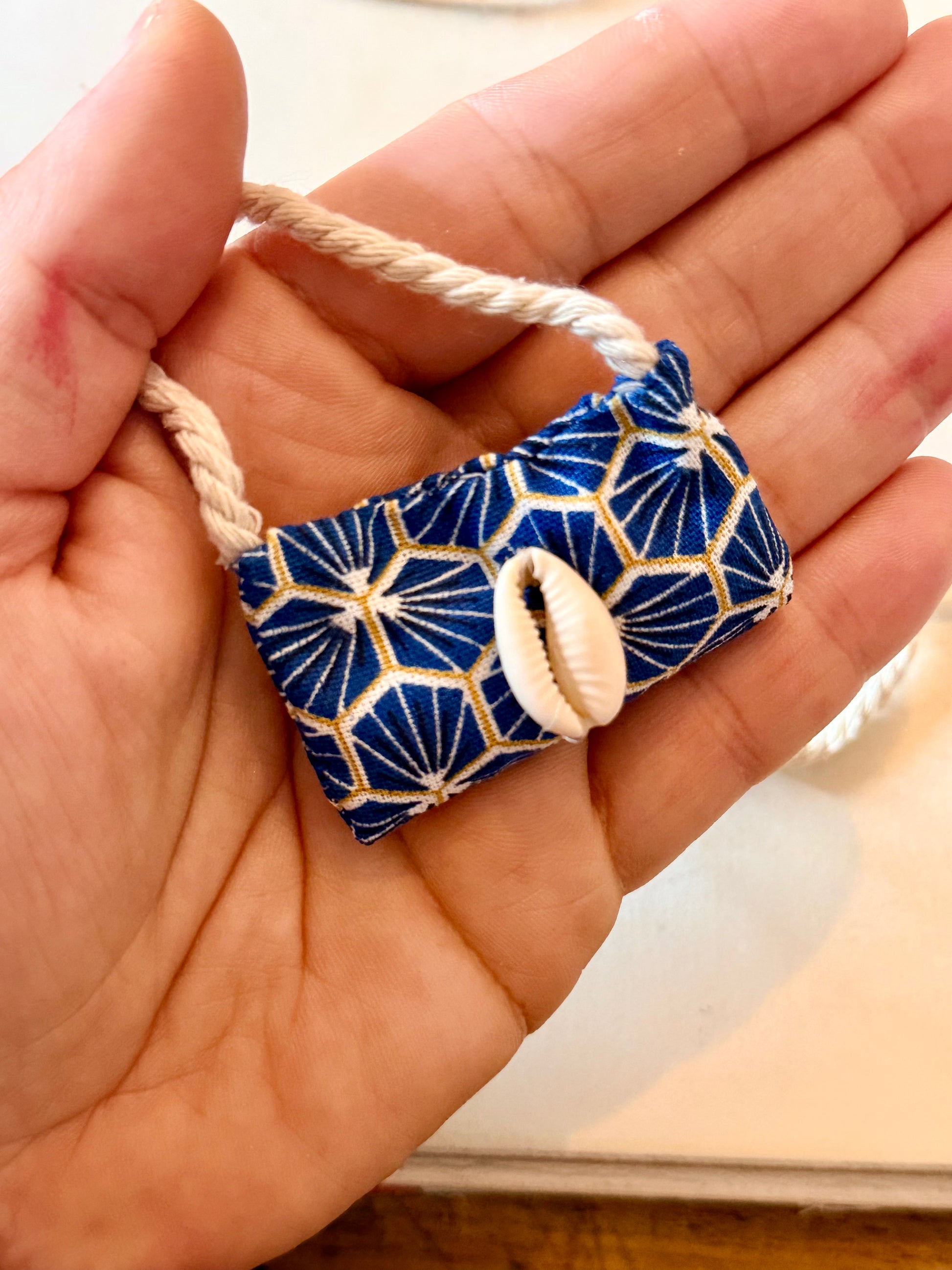 Chaque amulette est cousue à la main, dans un tissu symbolique bleu profond (couleur de l’apaisement, de la vérité et de la circulation intérieure).